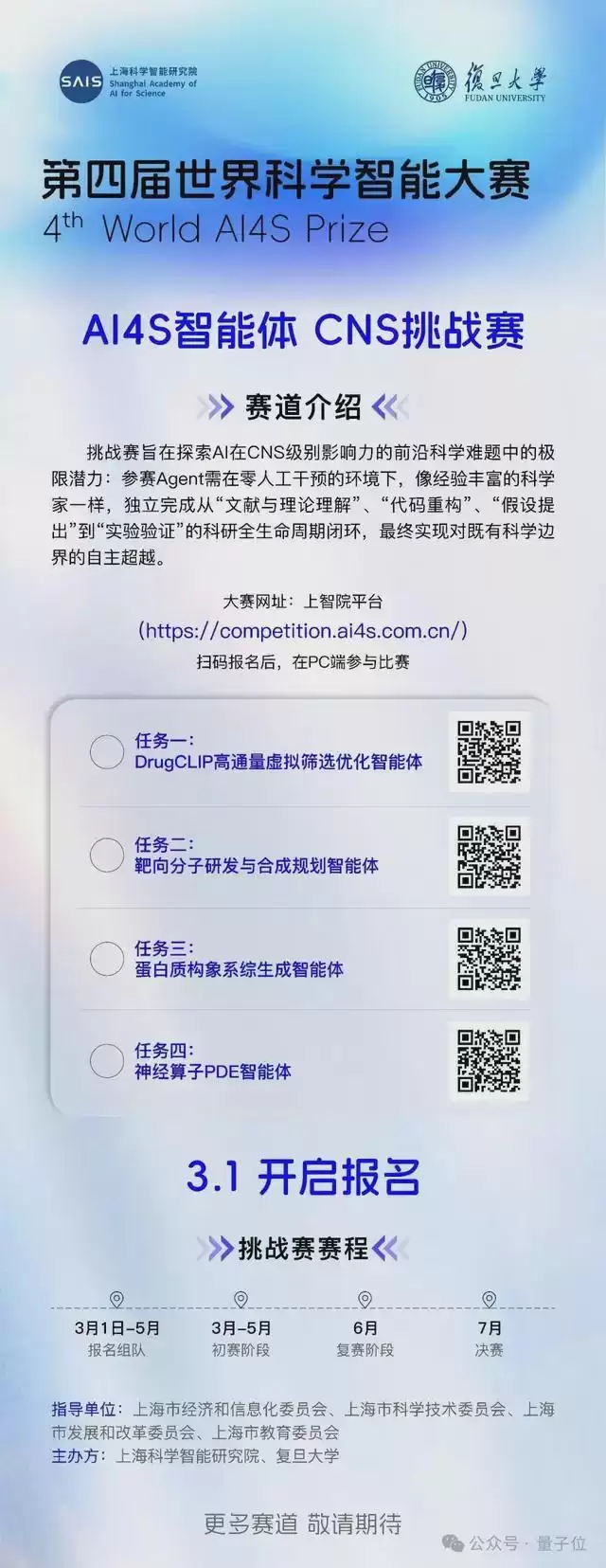 赛事将分为初赛、复赛、决赛三个赛段,共设置四项挑战任务,包括:高通量药物虚拟筛选优化、靶向分子设计与逆合成规划闭环、蛋白质构象系综生成挑战以及神经算子自动改进。评审包括金力、龚新高等顶尖科学家。
