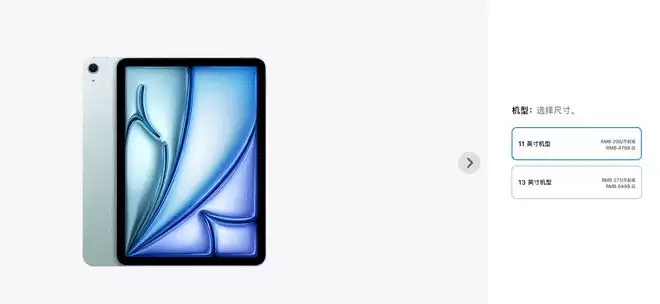 价格方面,搭载M4处理器的iPad Air提供11英寸和13英寸两种尺寸,存储容量从128GB起步,最高可选1TB,起售价为4799元,将于3月11日正式上市销售。