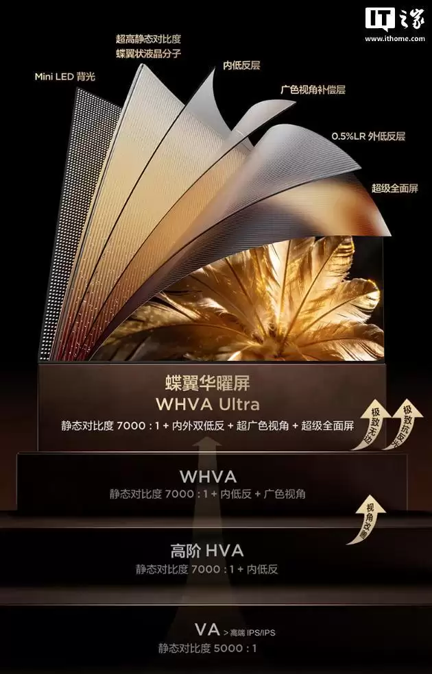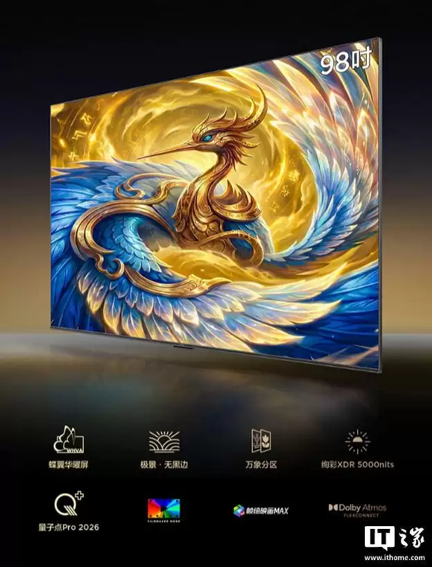 根据最新产品介绍,鹤7 Pro系列采用了名为“极景·无黑边”的QD-Mini LED蝶翼华曜屏,静态对比度最高可达7000:1。具体规格方面,65英寸版本为1680分区,峰值亮度4500尼特;75英寸版本提升至2716分区,峰值亮度5000尼特;85英寸版本为2880分区,峰值亮度5000尼特;而顶配的98英寸版本则拥有3840分区,并同样支持5000尼特的峰值亮度。