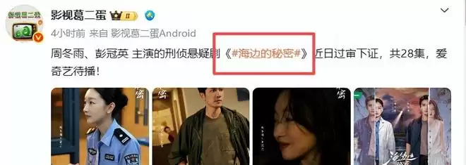 微博话题#海边的秘密过审#阅读量已突破4.2亿,衍生讨论中,“等周冬雨穿警服的样子等了十年”“彭冠英+周冬雨=悬疑剧安全绳”“别注水!别魔改!让我们看到真正的刑侦逻辑”等声音高频共振。