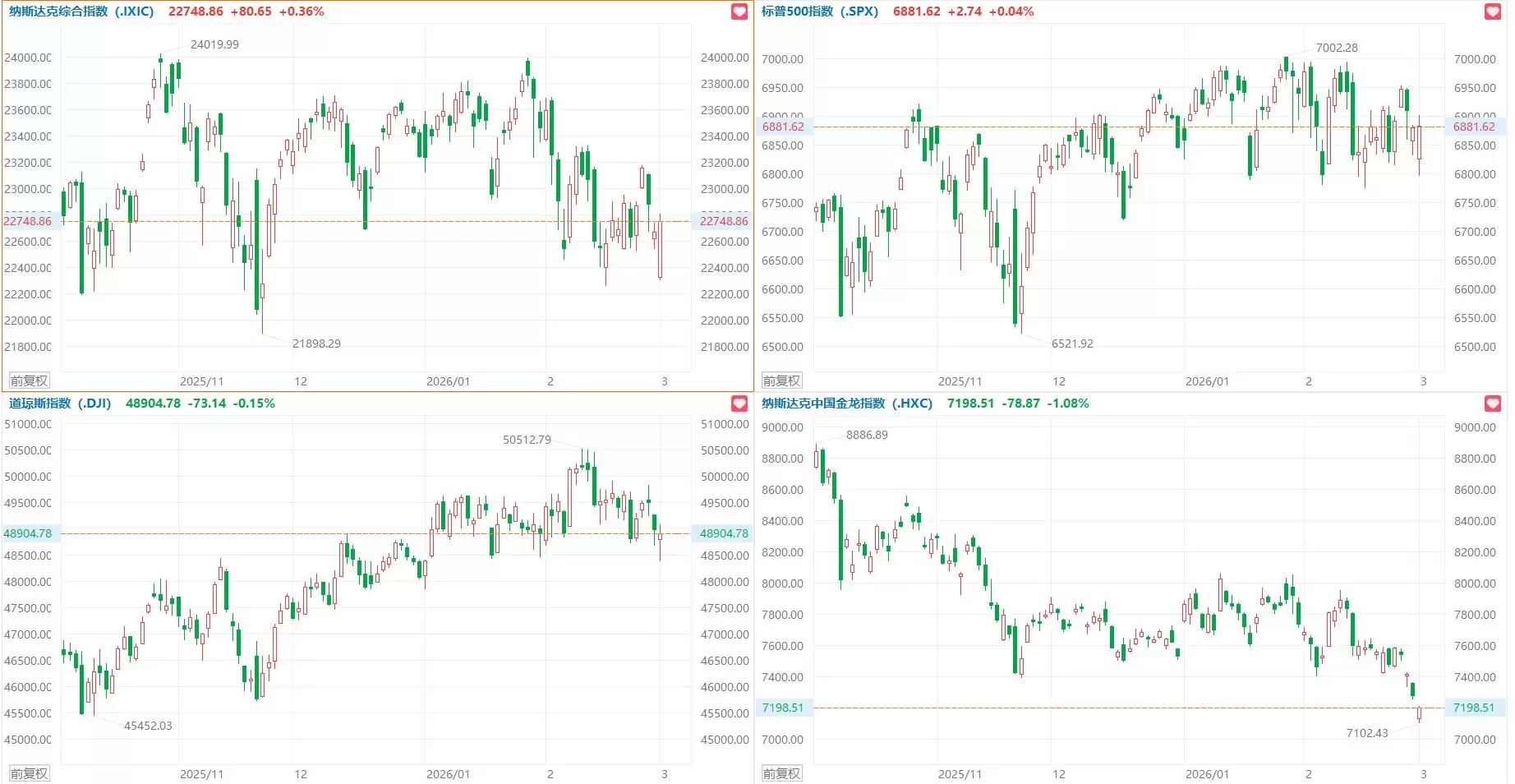 3月3日,美股三大指数收盘表现分化。道琼斯工业平均指数微跌0.15%,标普500指数小幅上涨0.04%,纳斯达克综合指数则攀升0.36%。大型科技股多数上扬,英伟达涨幅接近3%,微软上涨超过1%,苹果、特斯拉、奈飞和meta也均有小幅走高。相比之下,谷歌下跌逾1%,英特尔和亚马逊则出现小幅回落。
