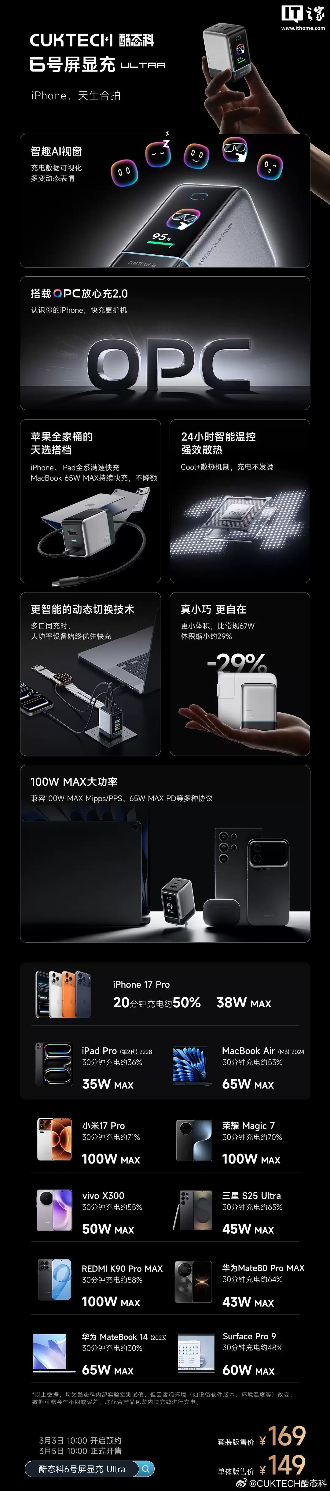 IT之家 3 月 3 日消息,酷态科 6 号屏显充 Ultra 充电头今日正式发布,单体版 149 元,套装版 169 元(内含一根 6A 240W PD3 1 CtoC 编织数据线约 1 米)。酷