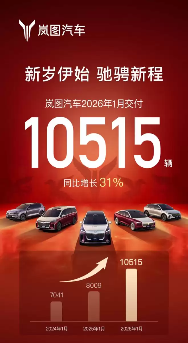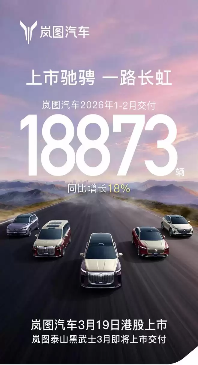 网易汽车3月3日报道,岚图汽车近日公布了2026年开年两个月的销量成绩单:1-2月累计交付量达到18873辆,较去年同期增长18%。