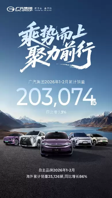 网易汽车报道,3月2日广汽集团正式公布了2026年2月的产销数据。统计显示,今年1-2月期间,广汽集团累计实现销量20.31万辆,较去年同期增长3%。与此同时,集团旗下自主品牌在海外市场表现尤为抢眼,累计出口销量达到2.51万辆,同比大幅增长86%。
