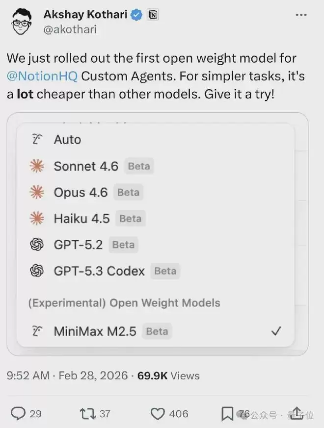 就在今天,Notion联合创始人Akshay Kothari宣布,Notion Custom Agents正式引入首个开源权重模型MiniMax M2.5,也意味着MiniMax M2.5不断深入国际主流生产力工具的核心场景。