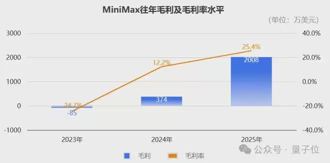 2025年,MiniMax的毛利为2008万美元,同比猛涨437%,且明显高于营收增速。