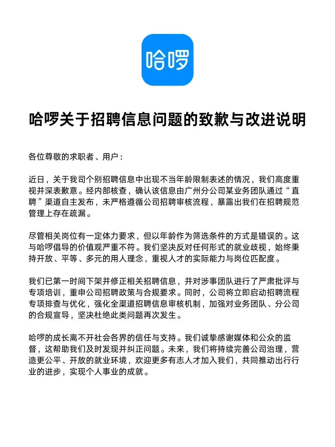 哈啰关于招聘信息问题的致歉与改进说明