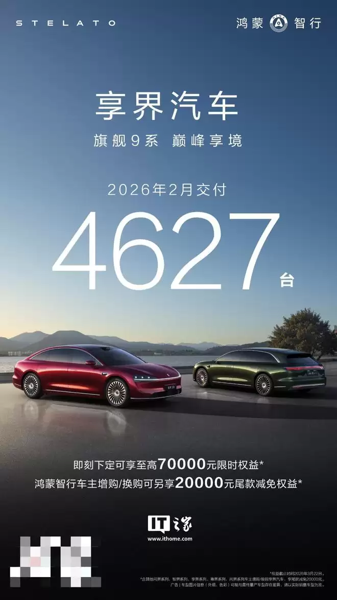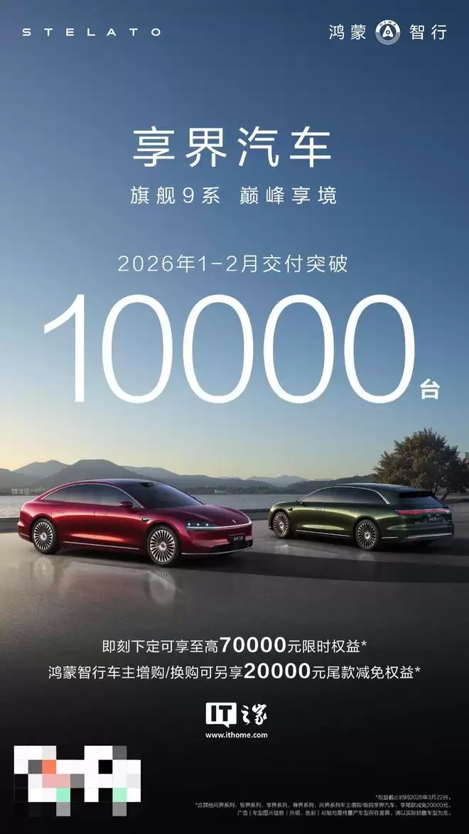 3月3日,IT之家报道了鸿蒙智行最新的交付数据。官方公布,旗下享界汽车在2月份交付了4627台。进入2026年,仅用两个月时间,累计交付量已突破一万台大关,品牌方称其“再创巅峰”。