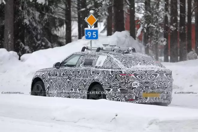 设计细节方面,新车前脸延续了家族经典的设计元素,配备狭长倾斜的大灯组与大尺寸前格栅。测试车不仅展示了隐藏式门把手和车顶行李架,还在车顶配备了两条大型鲨鱼鳍天线以及居中布局的摄像头模块。