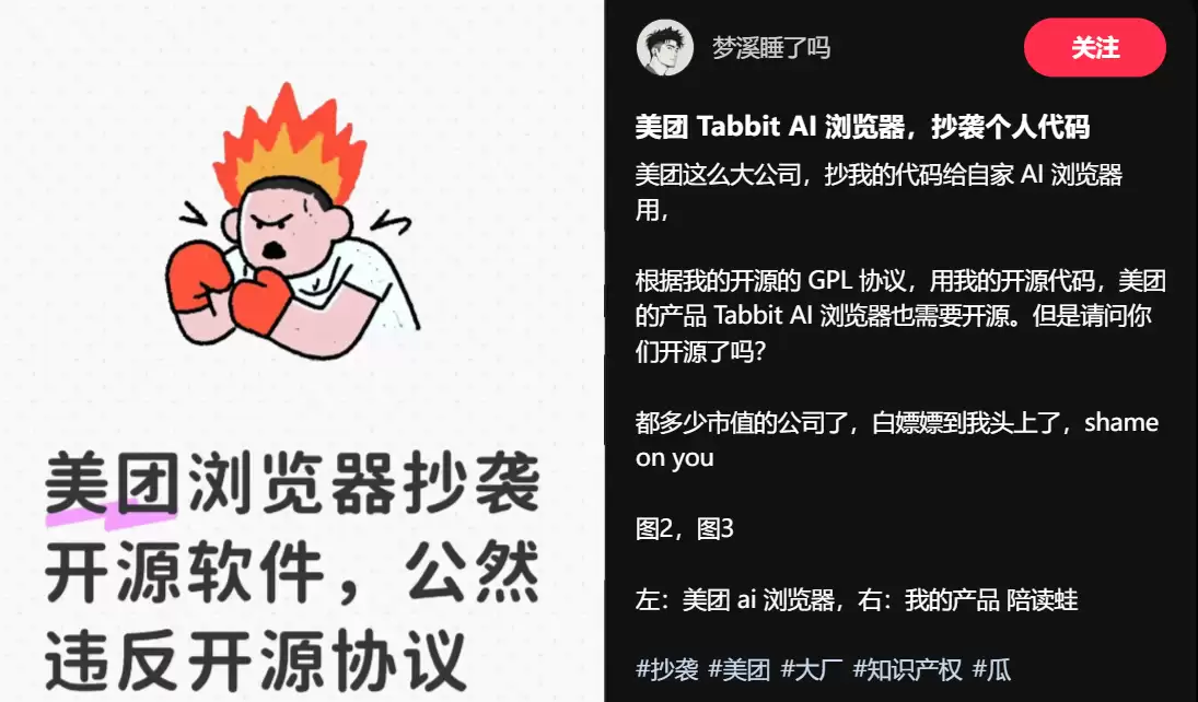 3月3日消息,网友“梦溪睡了吗”在社交平台上发帖,称美团的AI浏览器Tabbit抄袭其个人产品陪读蛙的代码,并放出了两款产品界面的对比图。网友表示,根据GPL协议,使用他的代码的产品都需要开源,而美