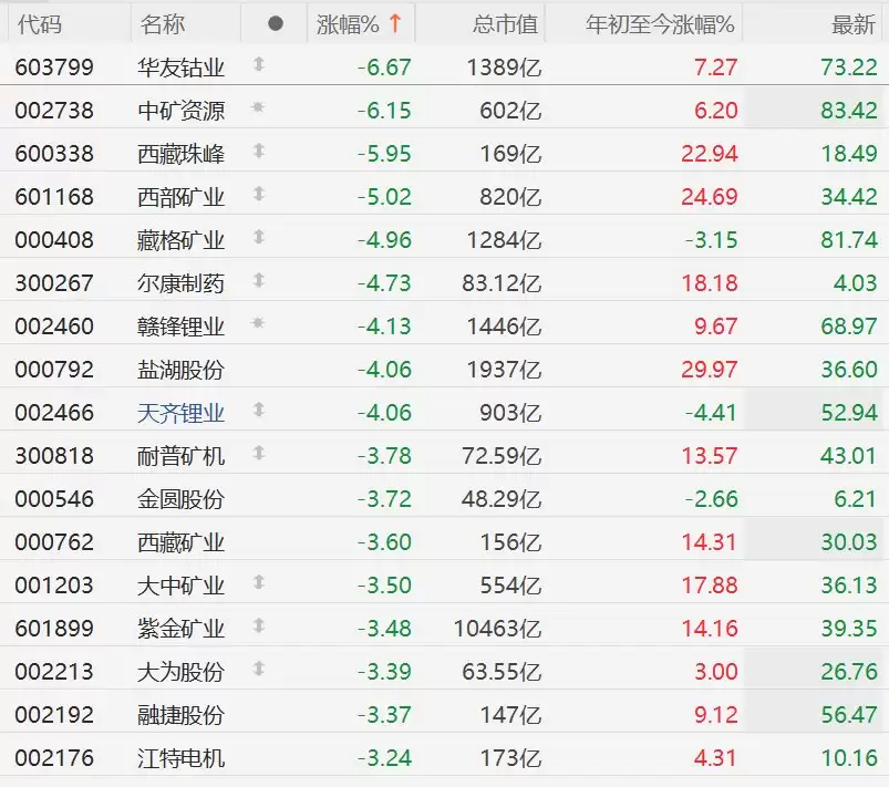 锂矿股集体下挫:赣锋锂业、盐湖股份跌幅超4%
