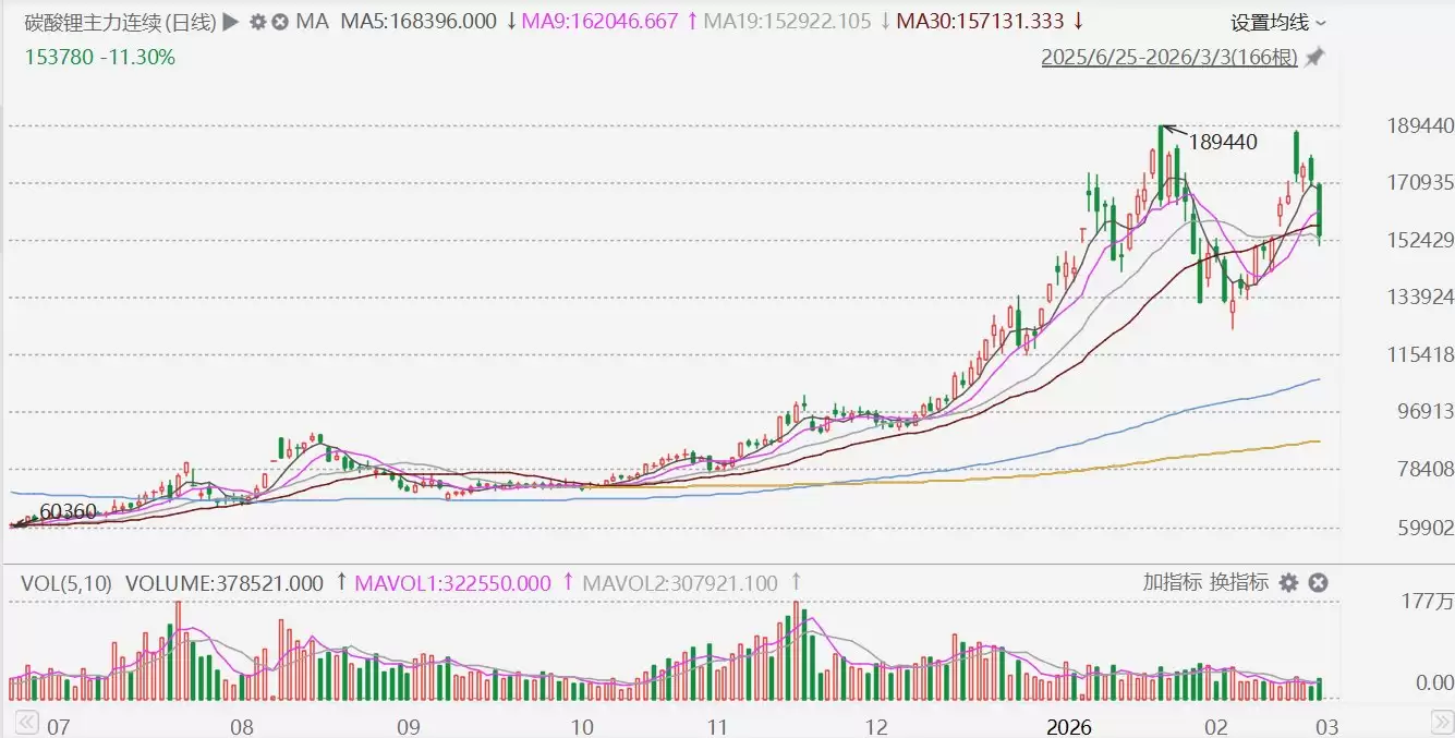 消息面上,碳酸锂主力合约今日大幅下挫,盘中一度触及跌停,跌幅达到12.99%,报收于150860元/吨。