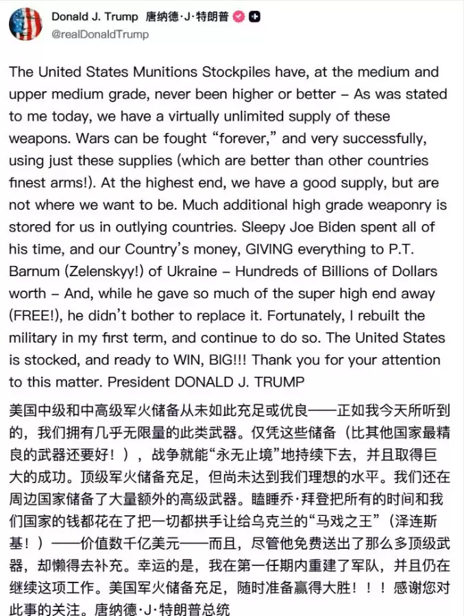 美国的弹药储备,从中等到中高等水平来看,从未像现在这样充足和优质——正如今天有人向我汇报的那样,我们拥有几乎无限供应的此类武器。仅凭这些储备(它们比其他国家的顶级武器还要好!),就可以“永远”打下去,并且赢得非常漂亮。在最高端武器方面,我们储备良好,但尚未达到理想状态。大量额外的高端武器存放在海外国家供我们使用。