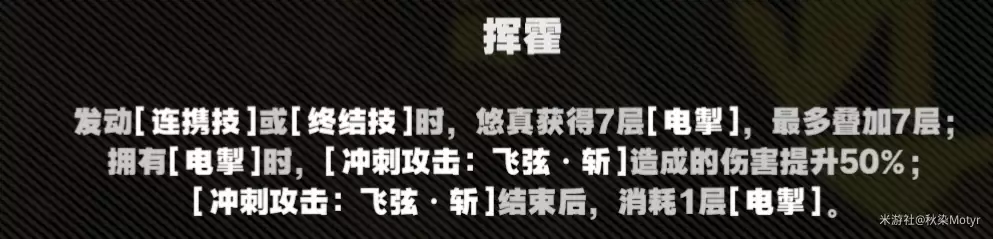 释放连携技或终极技后,他会立即获得7层「电杵」效果,接下来7次「飞弦·斩」冲刺攻击都能享受50%的伤害加成,每次攻击消耗1层,直到7层耗尽,从而在爆发窗口内打出极高的持续伤害。