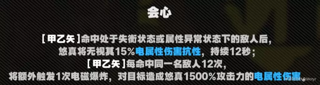 当「甲乙矢」命中失衡或属性异常的敌人后,他会无视目标15%的电属性伤害抗性,持续12秒,大幅提升电伤输出效率;同时,每命中同一敌人12次「甲乙矢」,就会额外触发一次电磁爆炸,造成1500%攻击力的高额电属性伤害,让持续输出过程中穿插强力爆发。