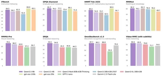 在指令跟随、多语言、视觉推理等多项基准评测中,Qwen3.5-9B在GPQA Diamond、MMMU-Pro、ERQA、Video-MME等多项评测中拔得头筹,大幅领先GPT-OSS-20B、GPT-5 nano、Gemini 2.5 Flash-Lite以及自家的Qwen3-Next-80B-A3B-Thinking、Qwen3-30B-A3B-2507。