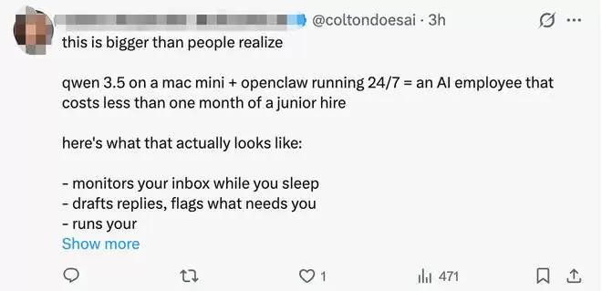 另一位开发者称:“这比人们想象的要强大得多。一台运行在Mac mini 上的Qwen 3.5加上24hx7全天候运行的OpenClaw,就能打造出一个成本不到一个月初级员工工资的AI员工。”