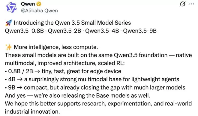 智东西3月3日报道,昨日晚间,阿里开源4款Qwen3.5小尺寸模型系列:Qwen3.5-0.8B、Qwen3.5-2B、Qwen3.5-4B、Qwen3.5-9B,可部署于笔记本电脑等端侧设备。