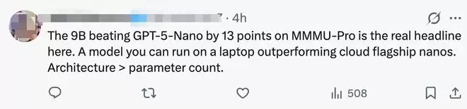 一位开发者称:“9B在MMMU-Pro测试中以13分的优势击败GPT-5-Nano才是真正的亮点。一个可以在笔记本电脑上运行的模型,性能却超越了云端旗舰级的Nano模型,架构优势远胜于参数数量。”