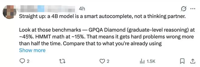 不过也有开发者直截了当地说:“4B模型只是一个智能自动补全工具,而不是一个思考伙伴。GPQA Diamond(研究生水平推理)的正确率约为45%,HMMT数学测试的正确率约为15%。这意味着它在难题上超过一半的概率都会出错。”