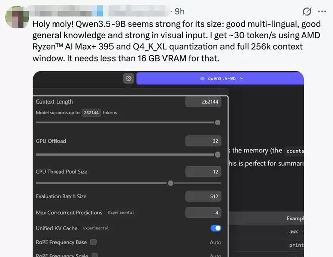 还有开发者分享,他使用AMD Ryzen AI Max+395处理器和 Q4_K_XL量化算法,并开启完整的256k上下文窗口,处理速度达到了约30个token/s。而且它只需要不到16GB的显存。对此他惊叹:“我的天!Qwen3.5-9B 的体积虽小,但性能却非常强劲:多语言处理能力出色,通用知识储备丰富,视觉输入处理能力也很强。”