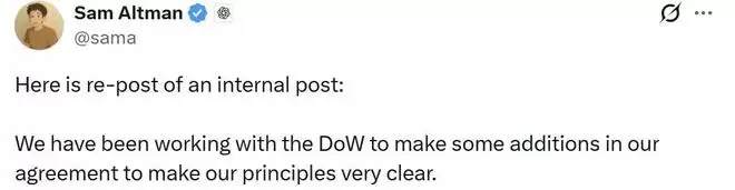 奥尔特曼同步发布了一份据称为“重发版”的内部备忘录,称公司正与国防部合作修订协议、明确原则,确保其平台不会被用于美国国内监控。