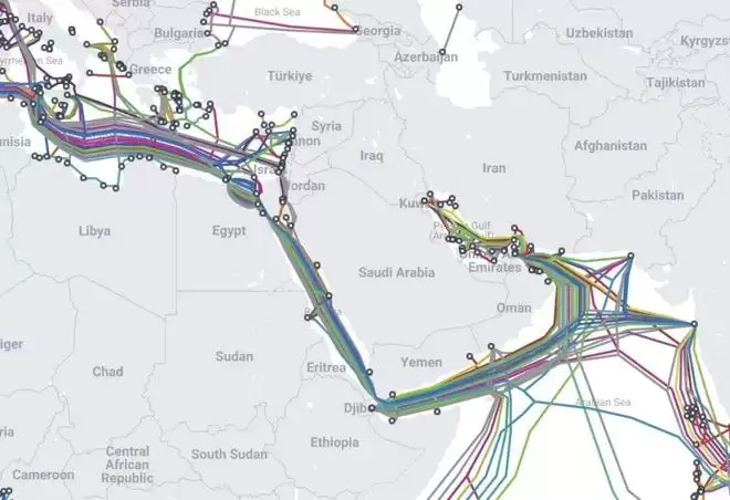 连接欧洲(EMA)和亚洲(APAC)的数条主干光缆(如 AAE-1, SMW5),几乎都汇聚在红海、曼德海峡和波斯湾这一狭长区域。