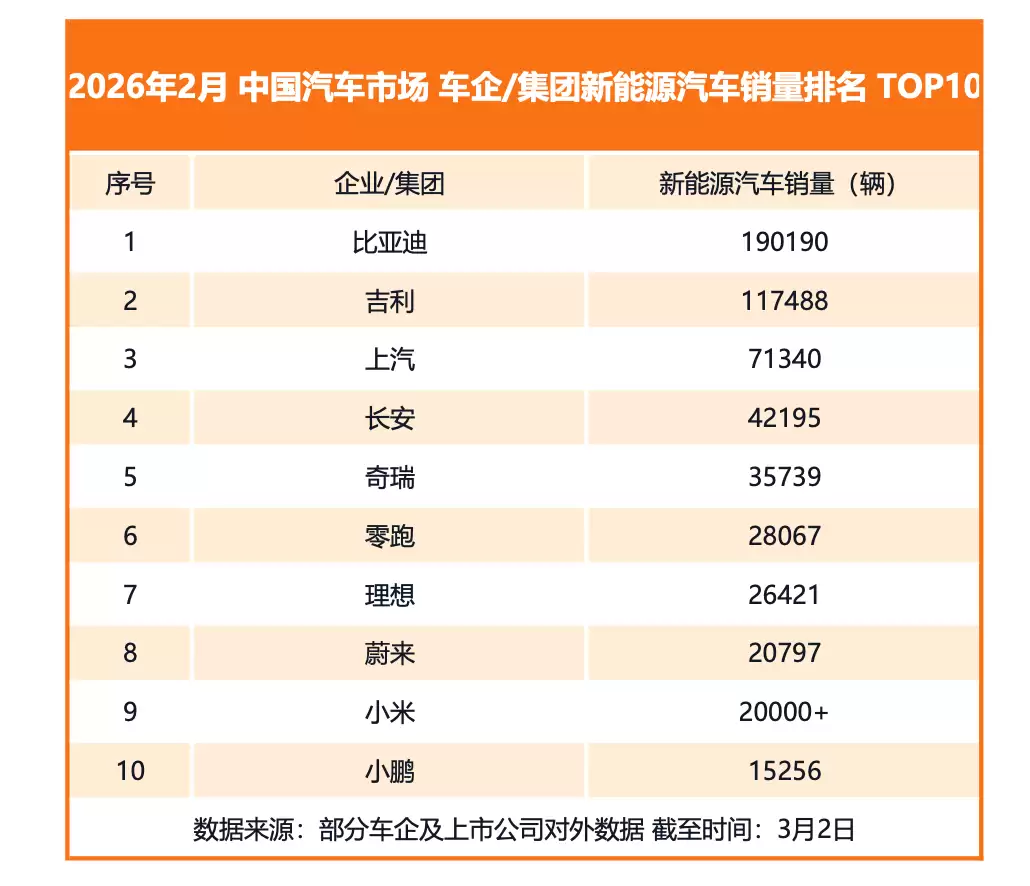 2026年伊始,中国新能源汽车市场的竞争版图愈发清晰。根据各大车企及其上市公司披露的经营数据,比亚迪集团今年2月的新能源汽车销量高达190,190辆,再度稳居行业榜首。其在主流车企中持续展现出显著的领跑优势,以稳健而强劲的市场表现巩固着头部地位。