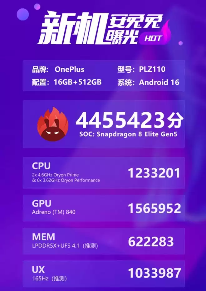 据了解,一加15T将搭载第五代骁龙8至臻版移动平台,配备16GB运行内存与1TB存储空间。在安兔兔V11测试中,其综合得分突破445万分大关,其中CPU成绩超过123万分、GPU成绩突破156万分、MEM成绩达62万分,UX成绩更是超过103万分。