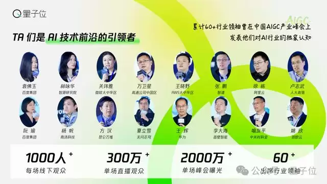 既有百度、阿里通义、智源研究院、智谱、面壁等技术先行者,也有蚂蚁集团、美图、逐际动力、金山办公、生数科技等应用探索者。微软、高通、AWS等带来了国际视野,快刀青衣、北大袁粒、狸谱一休等个人实践者亦活跃其中。截至目前,已有60+行业领袖登台分享前沿认知。