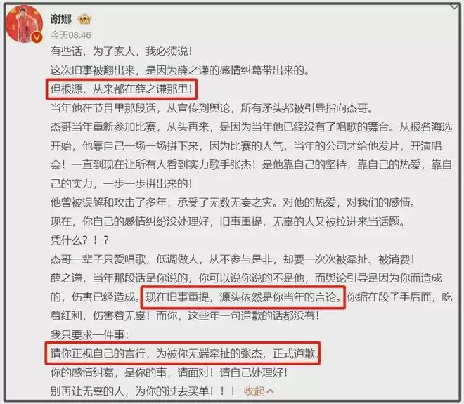 令人没想到的是,谢娜发文回应了,她要求薛之谦就内涵张杰吃软饭一事道歉,薛之谦一直没有回应。