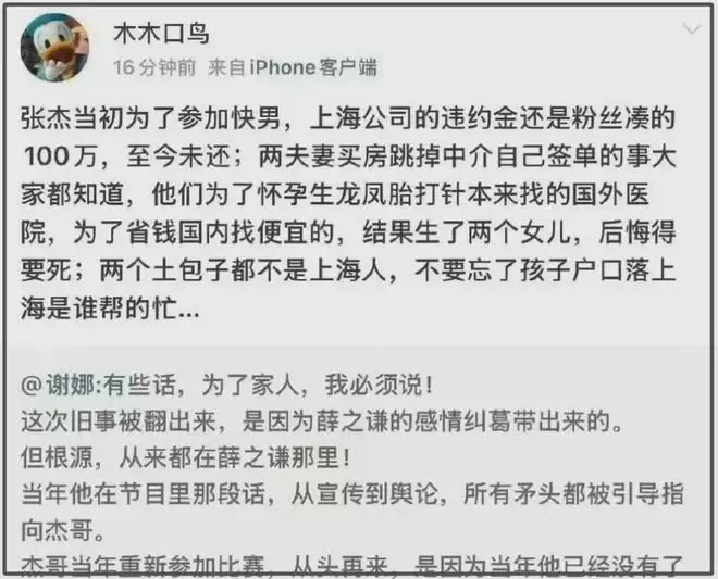 然而薛之谦好友为了维护自家兄弟,发文炮轰谢娜张杰夫妇,曝出张杰劈腿等猛料,这才有了张杰前女友下场。