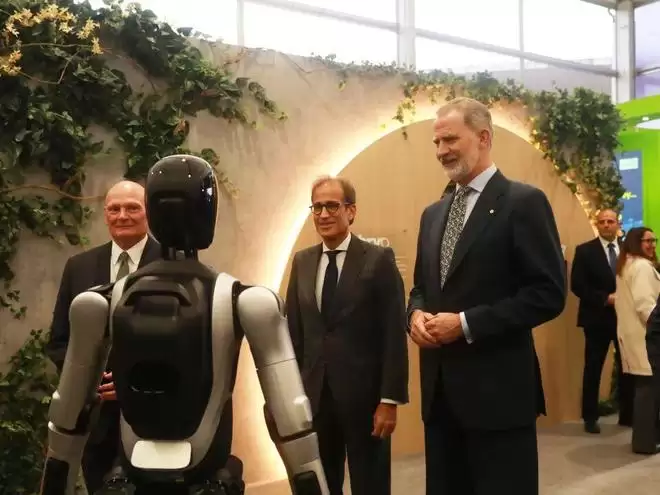 展会首日,我恰好逛到未来机场展厅,西班牙国王费利佩六世亲临智元展厅,而智元机器人旗下的“远征A2”,则化身专业智能向导,全程流畅地完成引导、讲解工作,稳稳陪同国王走完了整个展厅流程,这一幕瞬间成为现场最受关注的焦点,周围不少探展者纷纷驻足拍照记录。