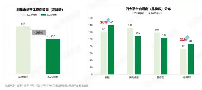 要知道,在行业发展的调整期,无论是剧集市场还是综艺市场,整体的招商规模都有收窄之势。此前,击壤洞察发布的《2025H1剧集广告大盘报告》数据显示,2025年上半年,剧集市场整体招商数量从上年同期的557家下降至412家,同比下降26%。