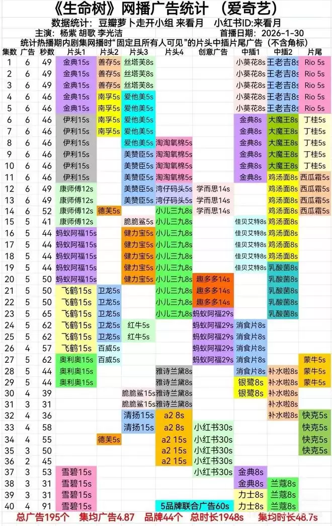 以多品牌抢注的《生命树》为例,单是片头首位的贴片广告,就在金典、伊利、康师傅、飞鹤、奥利奥、雪碧六个品牌之间切换,从剧集开播到结束,单集的植入品牌更是换了好几轮。