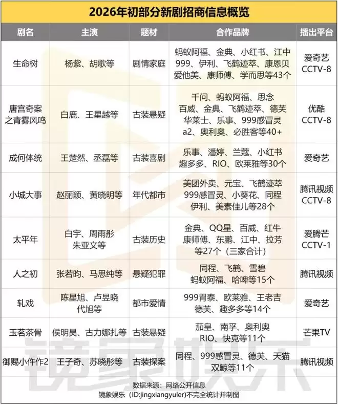 根据以往剧集市场的招商表现,单部剧集能拿到40+品牌合作,已经是超级头部的水平,如《墨雨云间》《玫瑰的故事》《繁花》等现象级爆剧,品牌合作数量都在40家以上。过去几年,每年产出的招商40+的剧集数量都在3~5部,对比之下,2026开年就跑出《生命树》《唐宫奇案之青雾风鸣》两部招商40+的剧集,含金量无需赘言。