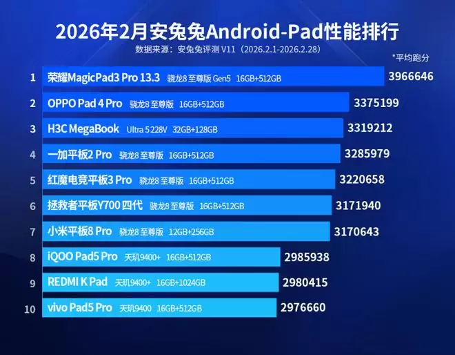 位列第二的是OPPO Pad 4 Pro,使用骁龙8至尊版,均分达337.5万;第三名则为H3C MegaBook,采用Ultra 5228V,均分为331.9万。
