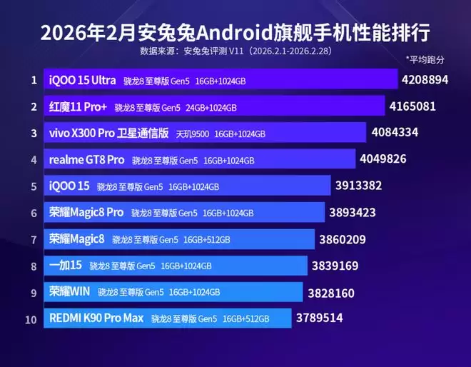 而从整体看,旗舰榜前十有八台是骁龙8 Elite Gen5,天玑9500只有两台,高通在绝对性能上依然保持统治力,联发科靠能效和影像差异化守住阵地。