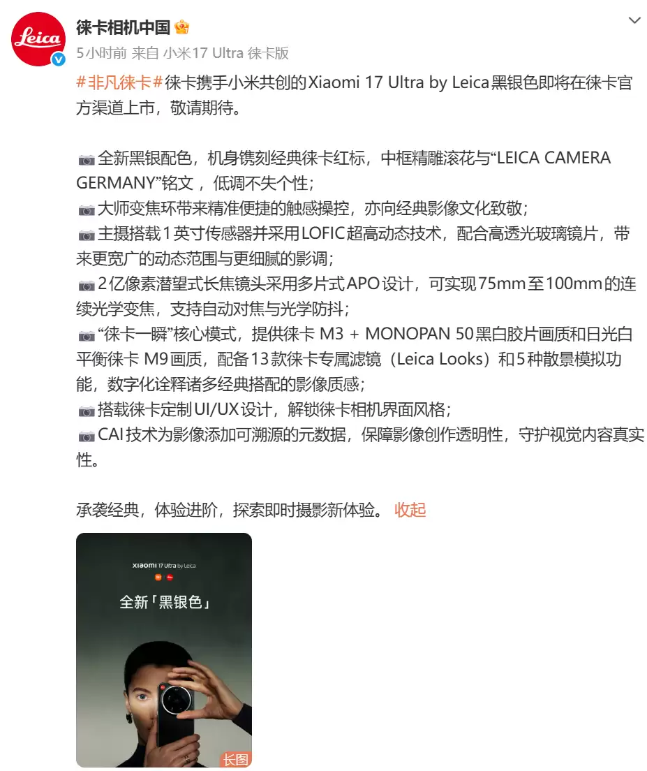 3月3日,徕卡相机中国官方微博发布消息,宣布与小米联合打造的xiaomi 17 Ultra by Leica黑银配色版将在徕卡官方渠道正式发售。具体上市时间待定。