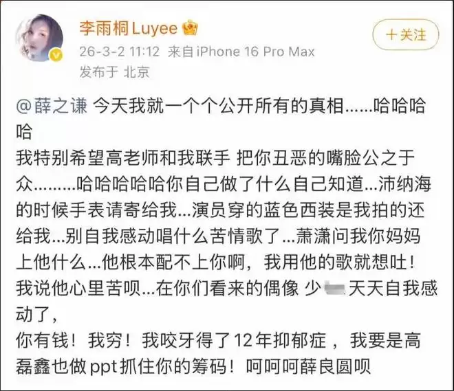但从李雨桐发布的那些微博来看,她目前似乎已陷入一种神志不清、甚至情绪失控的状态。她的言语都有些错乱,发布的内容也让人摸不着头脑。这也让人好奇,她究竟是受到了何种伤害,才会沦落至此。毕竟娱乐圈分手案例比比皆是,却很少见到像她这般反应的。既然已经分手,那便好聚好散,若有什么补偿要求,大可以私下协商解决。