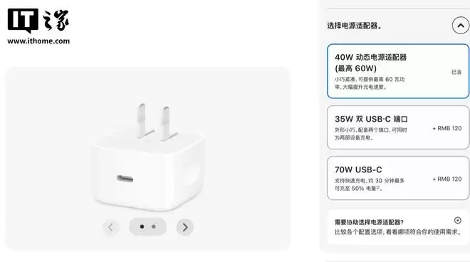 不过,苹果目前依然为用户提供定制电源适配器的选项。例如,可以额外支付120元,将适配器“升级”为35W双USB-C端口型号。用户也可以选择升级至70W USB-C电源适配器,其升级价格与35W双端口款相同。