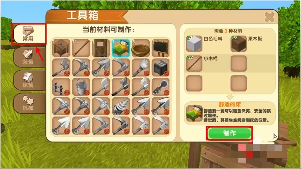 右键点击打开工作台,使用白色毛料和其他一些必备物品制作一张床。