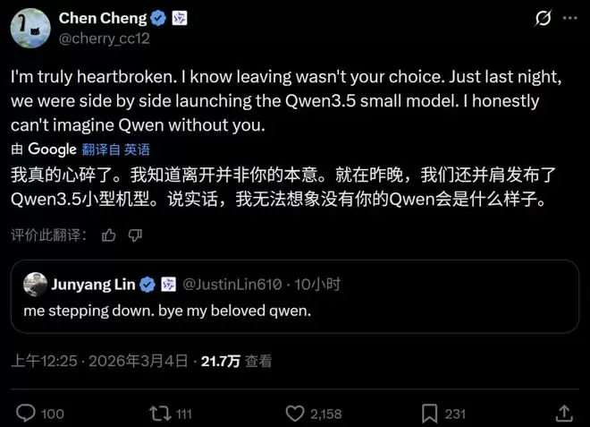 Qwen的核心贡献者陈诚在转发时写道:“我真的很难过。我知道离开不是你的选择。就在昨晚,我们还并肩发布了Qwen3.5小型号。说实话,我无法想象没有你的Qwen会是什么样子。”