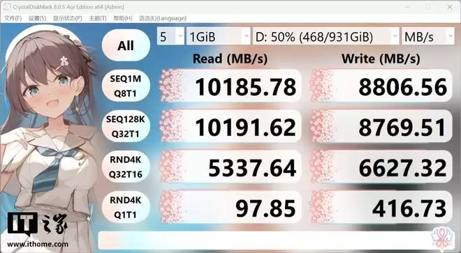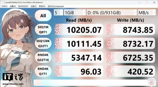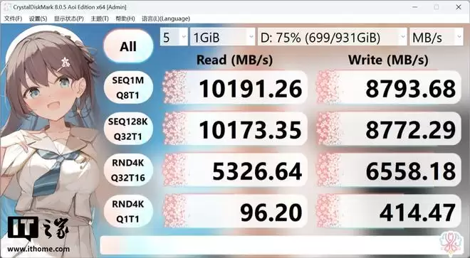 首先,IT之家通过硬盘跑分软件 Crystal Disk Mark 对其进行理论读写跑分,在空盘状态下铠侠 VC10 固态硬盘的顺序读取速度轻松跑到了 10000MB/s 以上,写入速度跑到了 8700MB/s 以上,基本符合最新标称数据。其 4K 读写速度分别达到了 5347MB/s 和 6725MB/s,毫无疑问属于 PCIe5.0 NVMe 固态的表现。