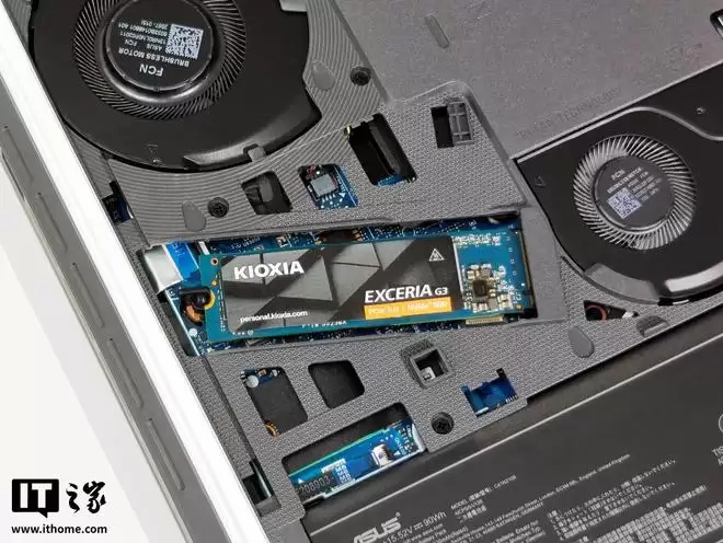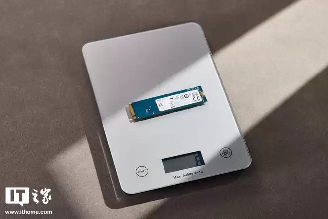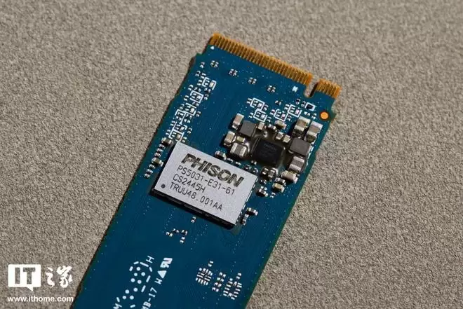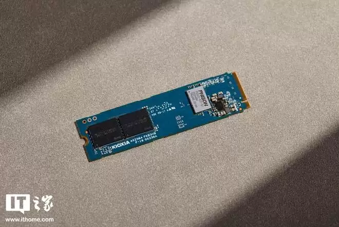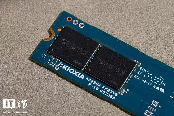 另一端为两颗板载铠侠原厂 NAND 闪存颗粒,也就是大家熟知的 BiCS8 FLASH QLC NAND 闪存颗粒,单颗容量 512GB。虽然采用了 QLC 颗粒,但在铠侠第八代 BiCS FLASH 最新 QLC 技术加持下,通过将 CMOS 外围电路和存储阵列进行键合连接,显著缩短了信号传输路径,从而有效降低能耗与延迟,优化整体性能。