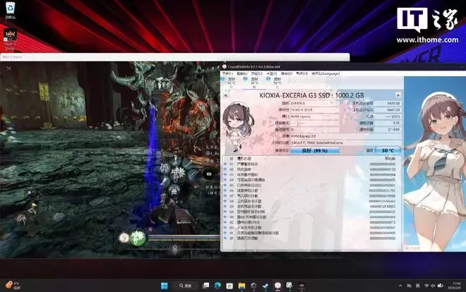 接着,我们运行安装在铠侠 VC10 固态硬盘中的《仁王 3》游戏,万万没想到游戏运行时的硬盘实时温度居然更低,只有 30°C,不论是通过 CDM 测试还是 AIDA64 辅助验证,都只有 30°C,丝毫不会影响游戏体验。
