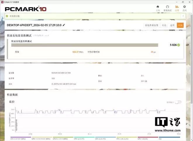 而在系统盘的测试项目中,铠侠 VC10 固态硬盘的最终成绩为 5026 分,其带宽速度为 602.37MB/s,平均存取时间为 25us,相比 PCIe4.0 主流固态硬盘的成绩直接翻倍,也是较为出色的水平。