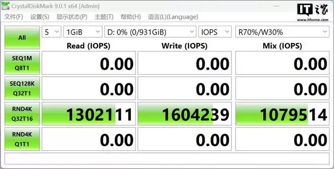 接下来是 4K 吞吐量的测试,铠侠 VC10 固态硬盘 1TB 版本分别跑出了 1302 KIOPS 和 1604 KIOPS 的随机读写成绩,相比最新标称的 4K 随机写入速度,实际成绩更高,可谓“反向虚标”,虽然成绩在 PCIe5.0 固态中不算顶尖,但跑分表现相当扎实。