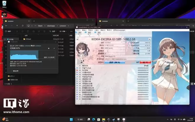 最后,我们通过一块外接固态硬盘向铠侠 VC10 固态硬盘中拷贝大容量游戏文件夹,拷贝进程过半后,外接的这块三星 990 PRO 在用辅助散热垫和金属外壳的情况下温度飙升到了 60°C,拷贝速度直接掉成“U 盘速度”,此时铠侠 VC10 固态硬盘的温度也来到了 62°C,这种大文件写入基本就是固态硬盘的极限负载场景了。综合来看,铠侠 VC10 固态硬盘的温度表现确实体现了其低功耗优势,非常适合为笔记本、游戏掌机等小尺寸移动设备进行扩容用途。