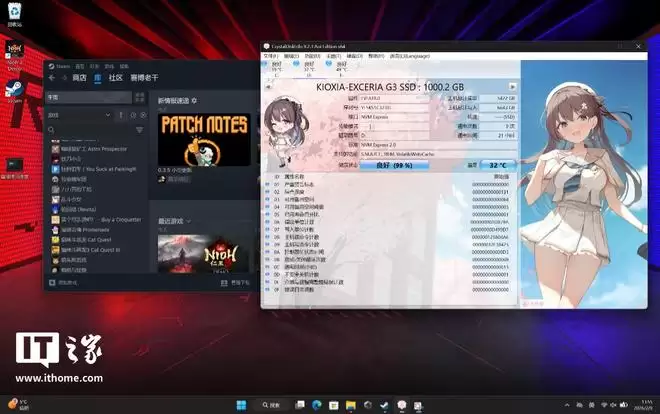 加装好固态硬盘后,我们在硬盘里安装一个 Steam 平台,并装好一款游戏。在仅打开 Steam 平台的待机状态下,CDM 的实时硬盘温度只有 32°C,甚至比游戏本出厂预装的三星固态还要低 7°C,可以说是非常凉爽了。